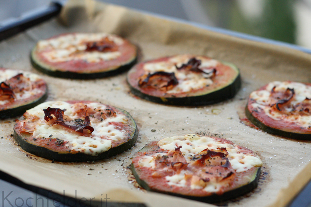 Ich schneide die Zucchinikeule in gleichdicke Scheiben, lege sie auf zwei mit Backpapier ausgelegten Blechen, bestreiche sie mit Tomatensugo, belege sie mit würfelig geschnittener Mozzarella, salze, belege sie noch mit gekochten Schinkenscheiben, reibe Origano zwischen den Handflächen darüber und träufle Olivenöl darauf.